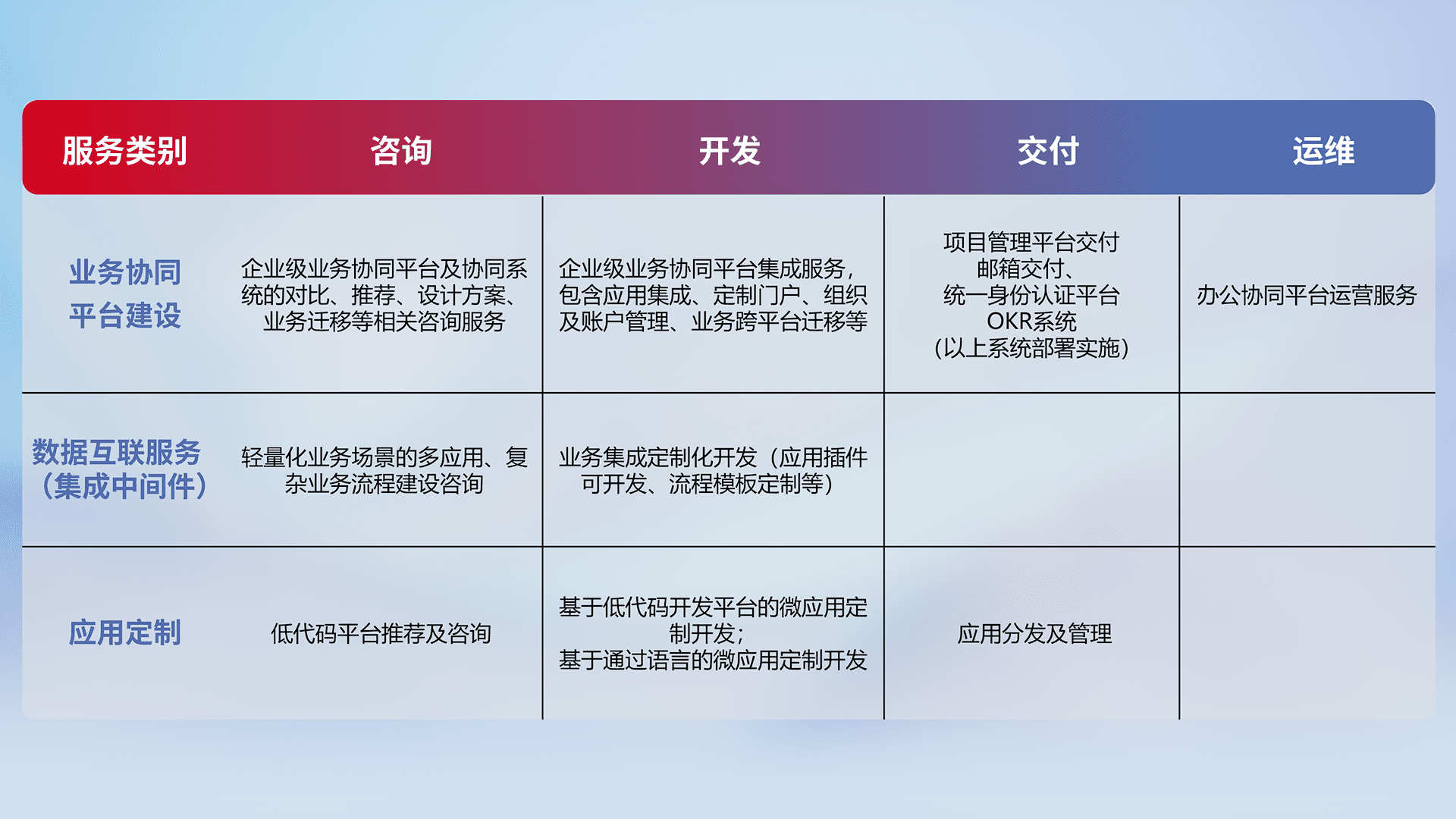 针对钉钉、、、、企微、、、IDaas等平台级产品提供产品的规划、、、方案、、交付、、、定制化开发等服务,,实现如统一协同办公、、、、智能客户服务、、混合会议管理、、、、智能数据查询、、、、等业务场景,,,实现数字化转型。。。